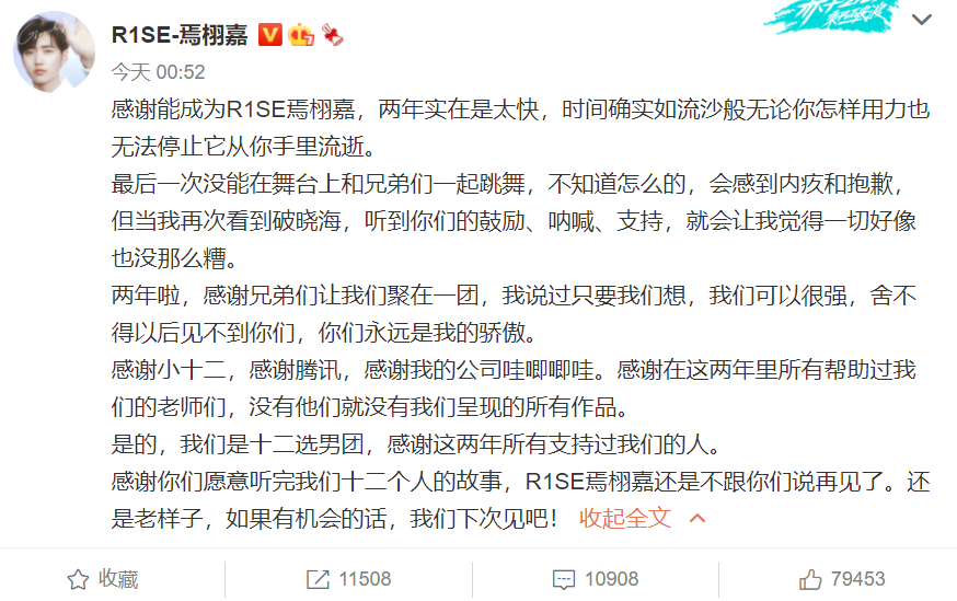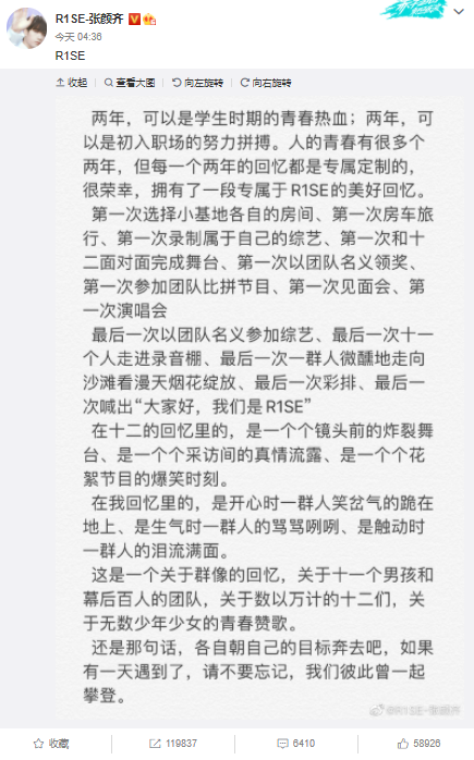 翟潇闻最没有诚意,他只说了一句:“R1SE,再见啦!”非著名娱评人吴清功指出:或许翟潇闻将是R1SE解散后发展最好的, 因为他要演耽改剧《天官赐福》了。还没爆红呢,现在就开始飘了?好歹多说几句话吧?
