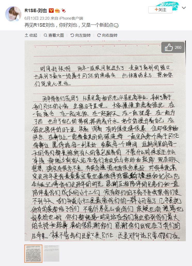 刘也手写了一封告别信,虽然很有诚意,但是因为字迹潦草,看起来有点费劲。刘也配文:“再见,R1SE刘也,你好刘也,又是一个新起点。”