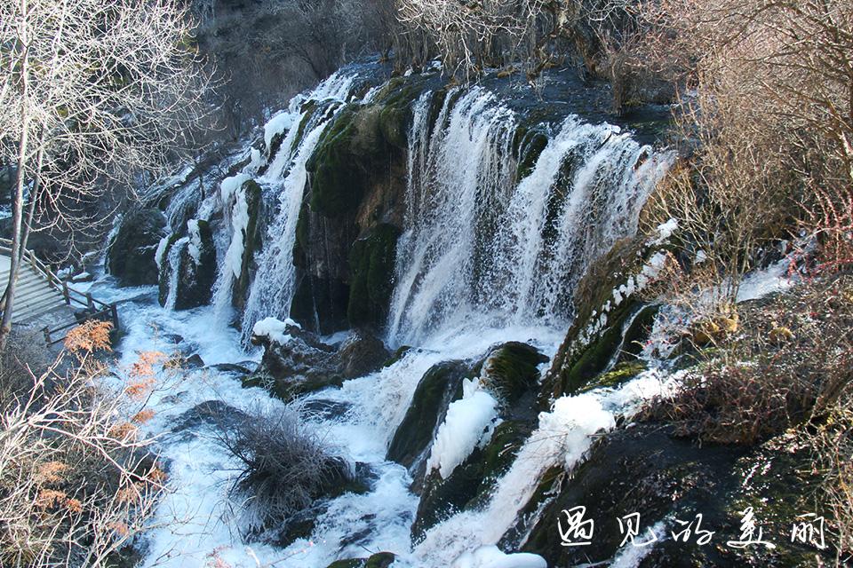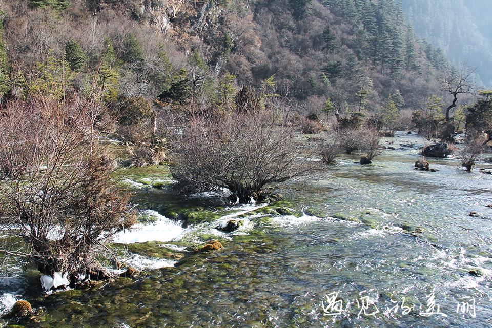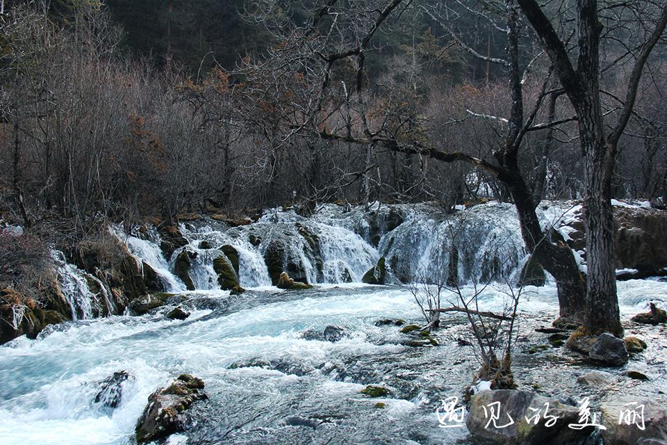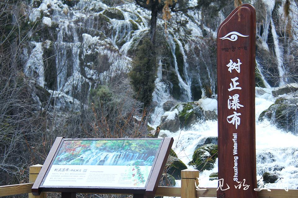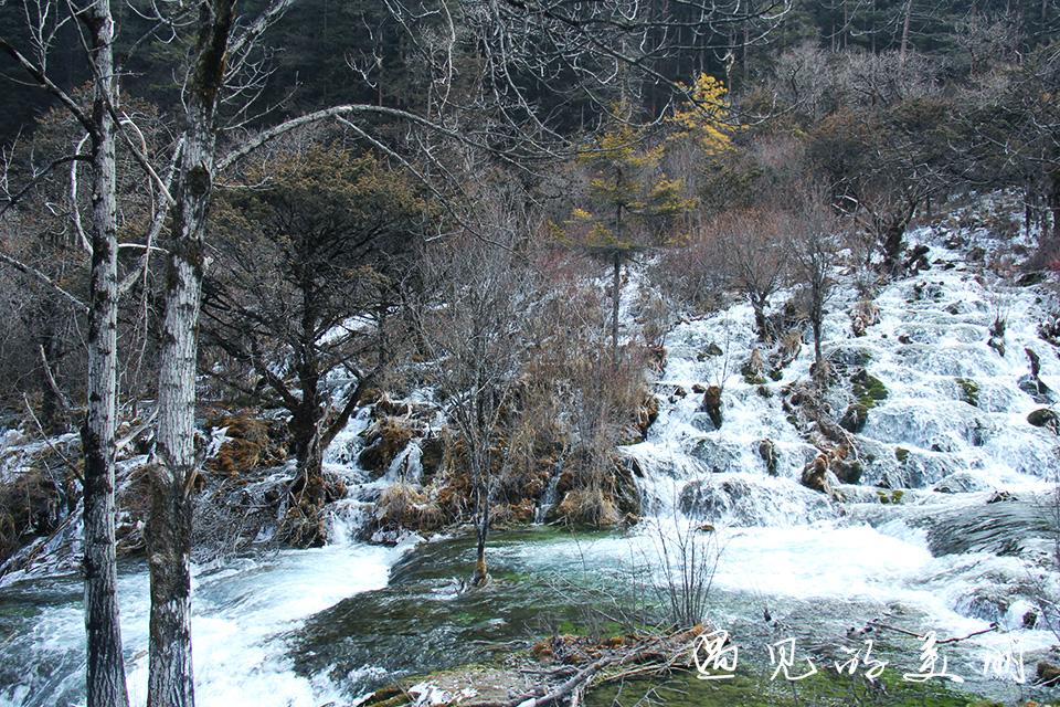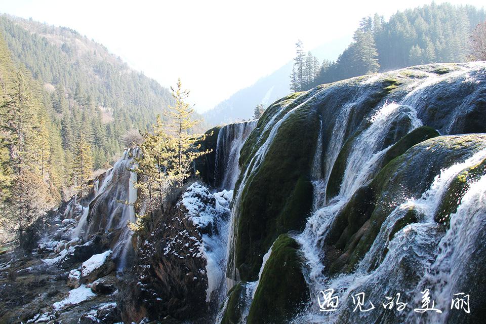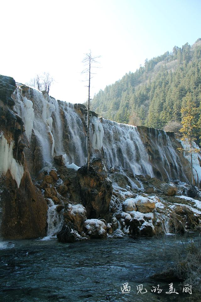 九寨沟树正群海树正瀑布树正瀑布是进入九寨沟后能看见的第一个瀑布,也是九寨沟四大瀑布中最小的一个。虽然最小,但也能让初游九寨沟的我惊心动魄。湖水沿着浅滩四处漫流,被水中的树丛分成无数股细流,最后汇集到树正瀑布顶端的山崖边,奔流附落,水雾四散,构成了神采飘逸,气度雍容的一片水帘。由于天气不是特别寒冷,没有看到向往很久的蓝冰。积雪夹杂在树丛中,冰晶凝结到树根处,湖水欢快地流淌着。这时候,我好想变成一只鸟,飞在树正瀑布的上空,将树正瀑布与树正群海看个真真切切。