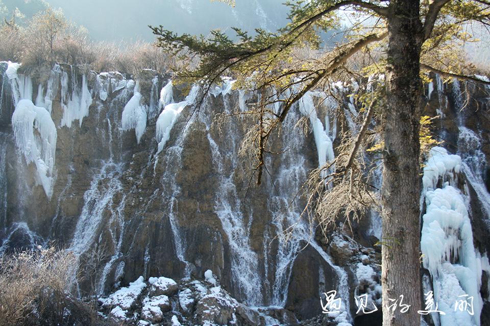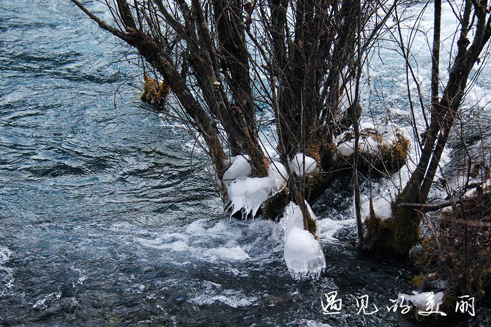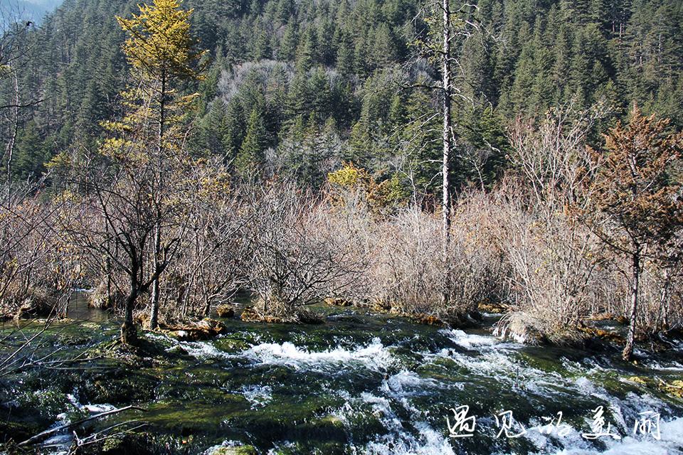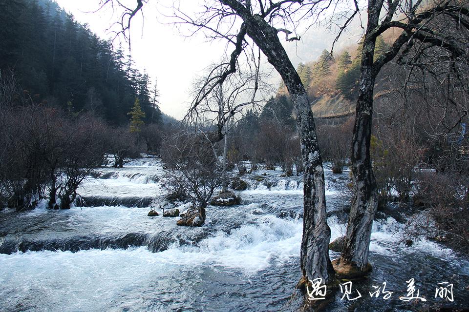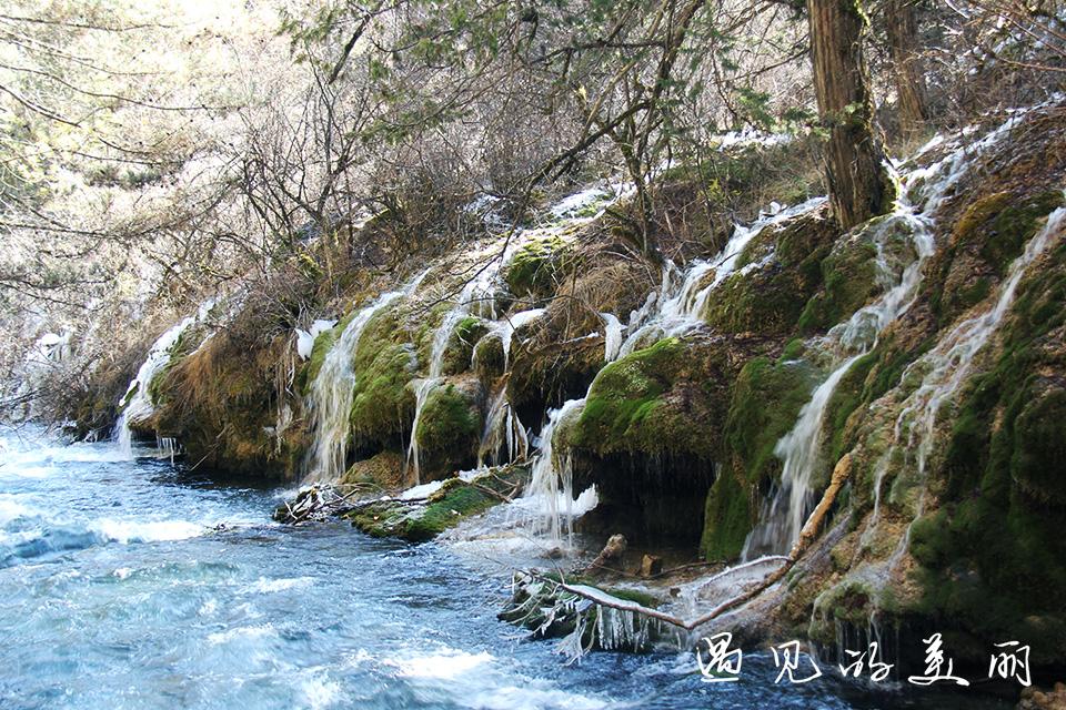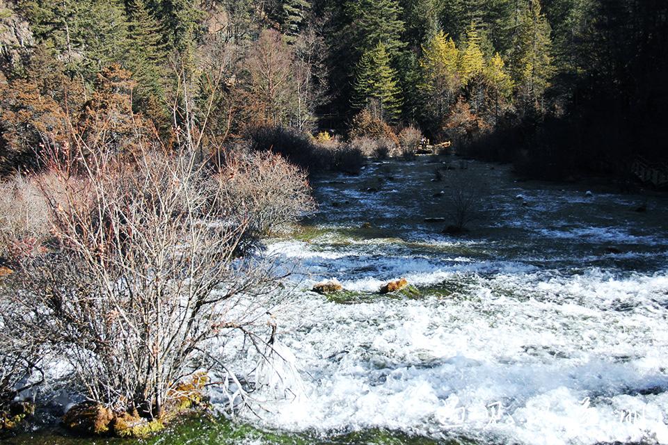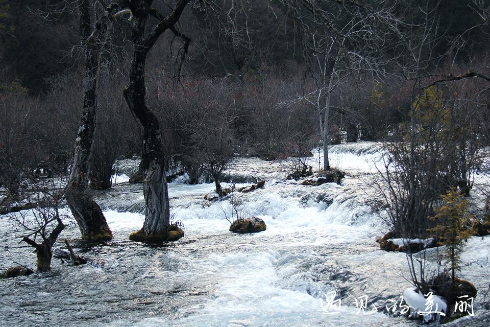 九寨沟树正群海树正瀑布树正瀑布是进入九寨沟后能看见的第一个瀑布,也是九寨沟四大瀑布中最小的一个。虽然最小,但也能让初游九寨沟的我惊心动魄。湖水沿着浅滩四处漫流,被水中的树丛分成无数股细流,最后汇集到树正瀑布顶端的山崖边,奔流附落,水雾四散,构成了神采飘逸,气度雍容的一片水帘。由于天气不是特别寒冷,没有看到向往很久的蓝冰。积雪夹杂在树丛中,冰晶凝结到树根处,湖水欢快地流淌着。这时候,我好想变成一只鸟,飞在树正瀑布的上空,将树正瀑布与树正群海看个真真切切。