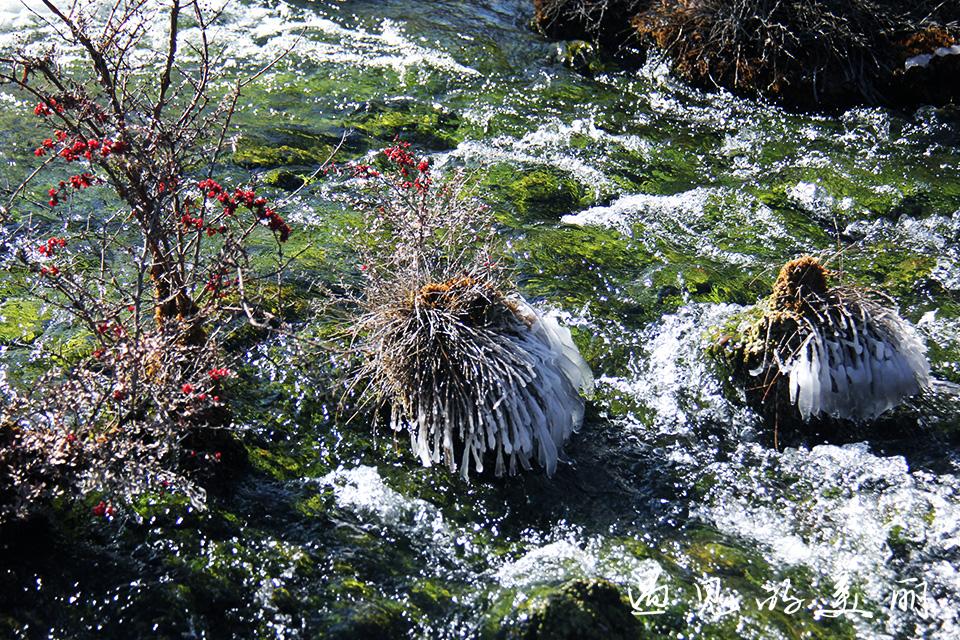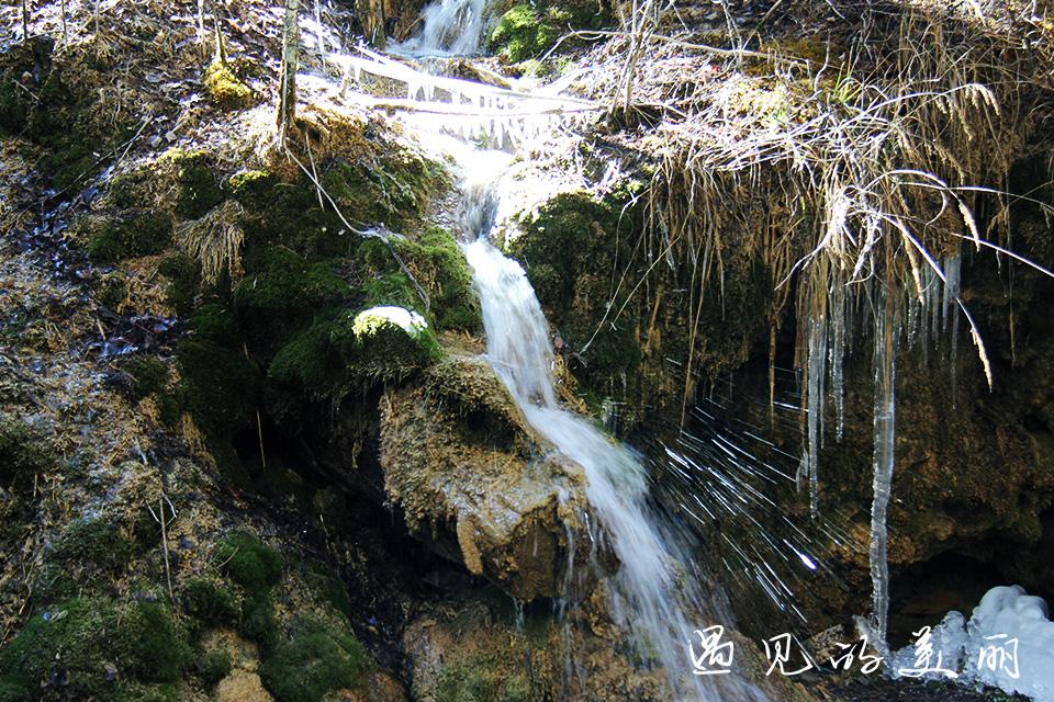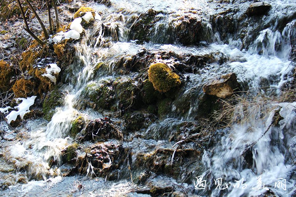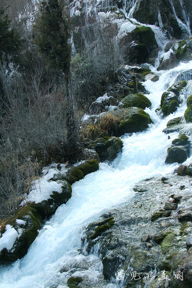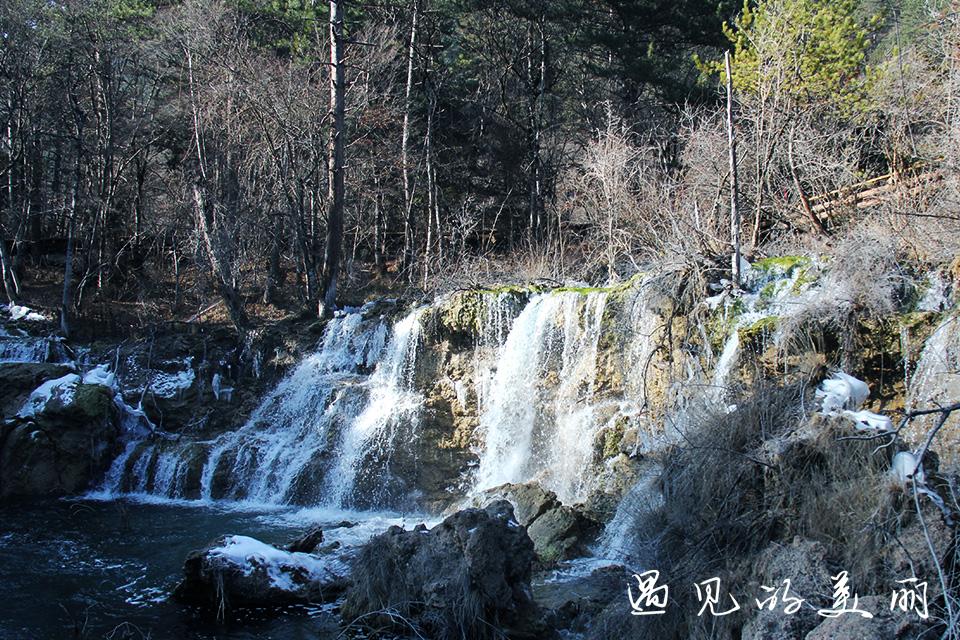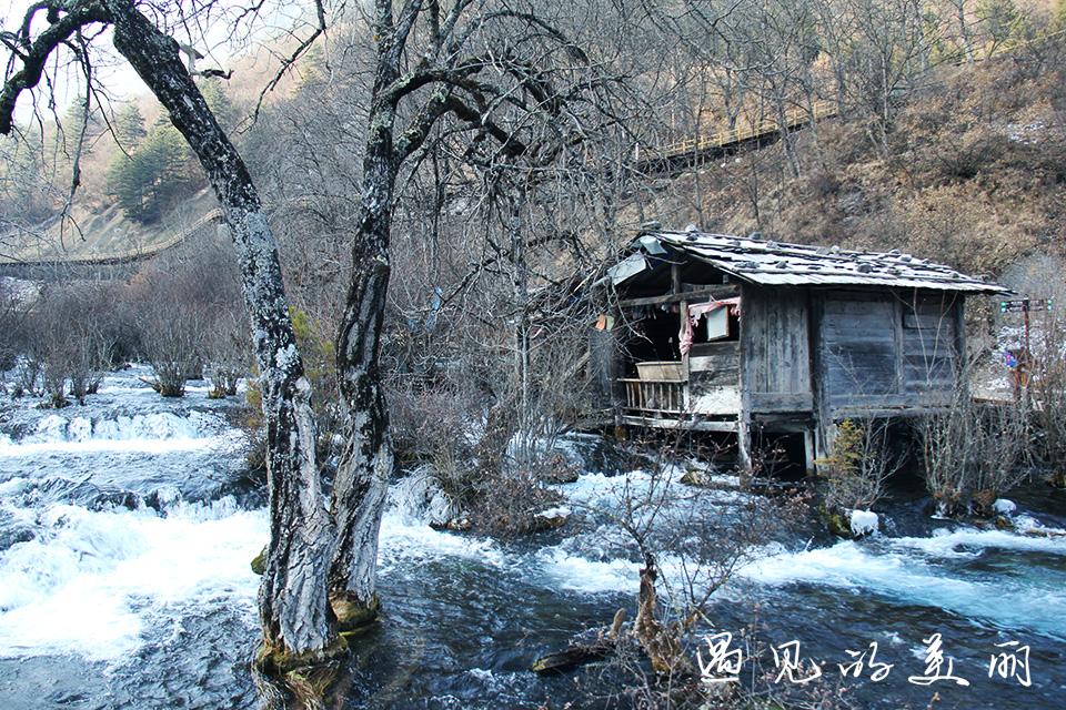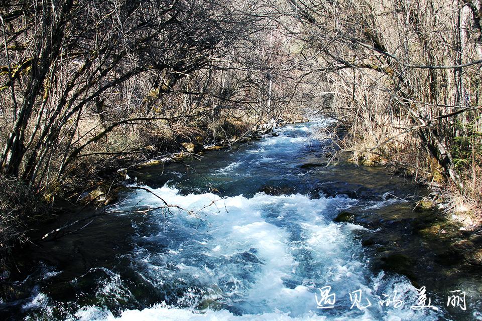 九寨沟树正群海树正瀑布树正瀑布是进入九寨沟后能看见的第一个瀑布,也是九寨沟四大瀑布中最小的一个。虽然最小,但也能让初游九寨沟的我惊心动魄。湖水沿着浅滩四处漫流,被水中的树丛分成无数股细流,最后汇集到树正瀑布顶端的山崖边,奔流附落,水雾四散,构成了神采飘逸,气度雍容的一片水帘。由于天气不是特别寒冷,没有看到向往很久的蓝冰。积雪夹杂在树丛中,冰晶凝结到树根处,湖水欢快地流淌着。这时候,我好想变成一只鸟,飞在树正瀑布的上空,将树正瀑布与树正群海看个真真切切。