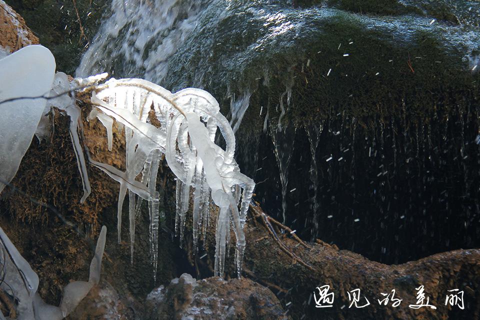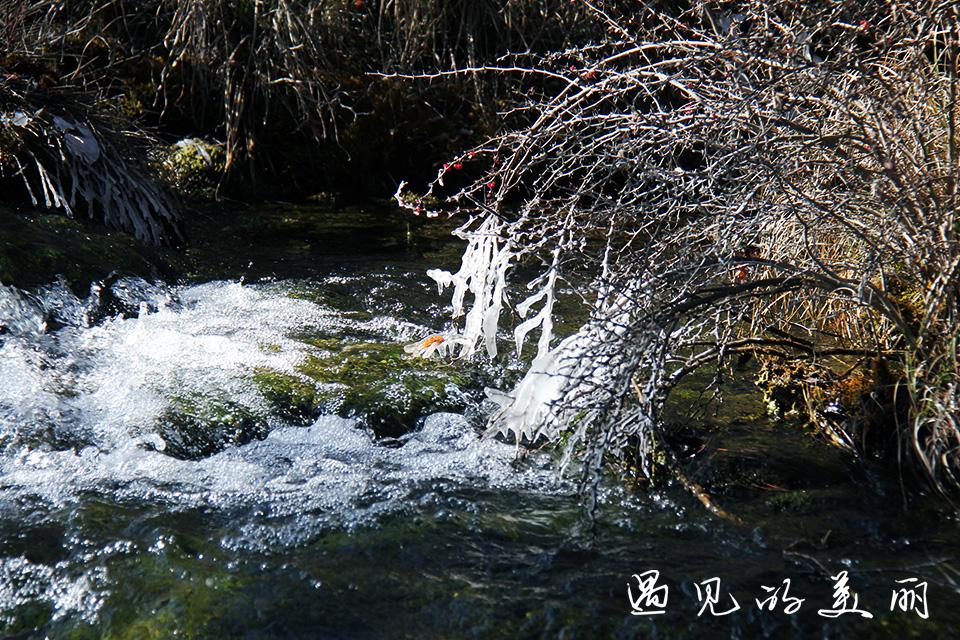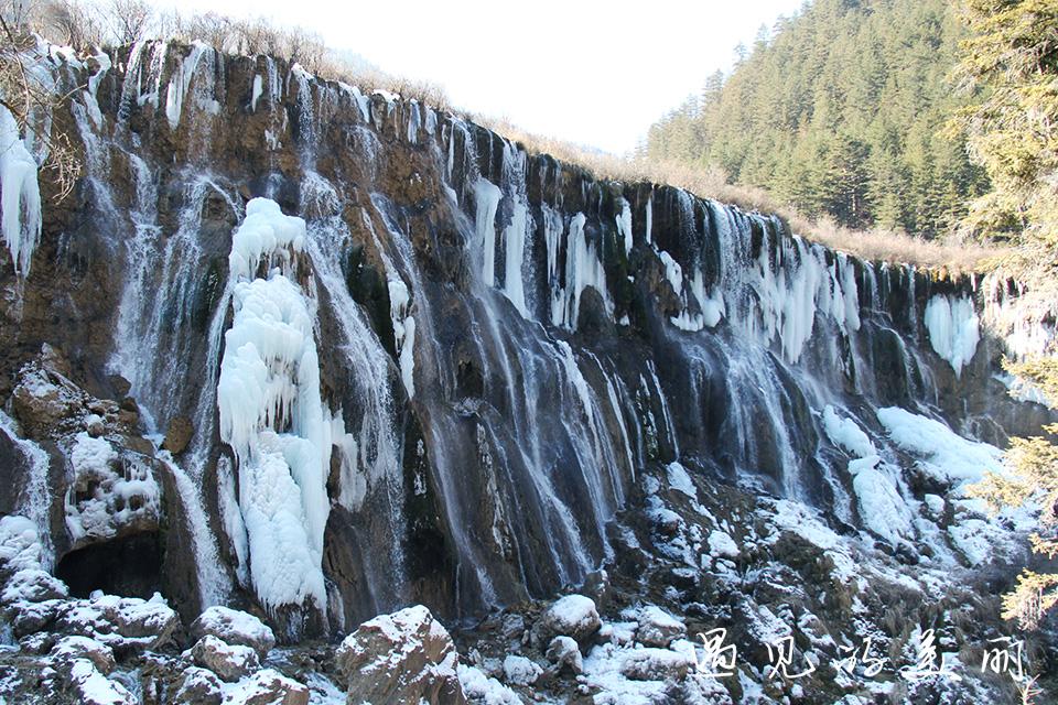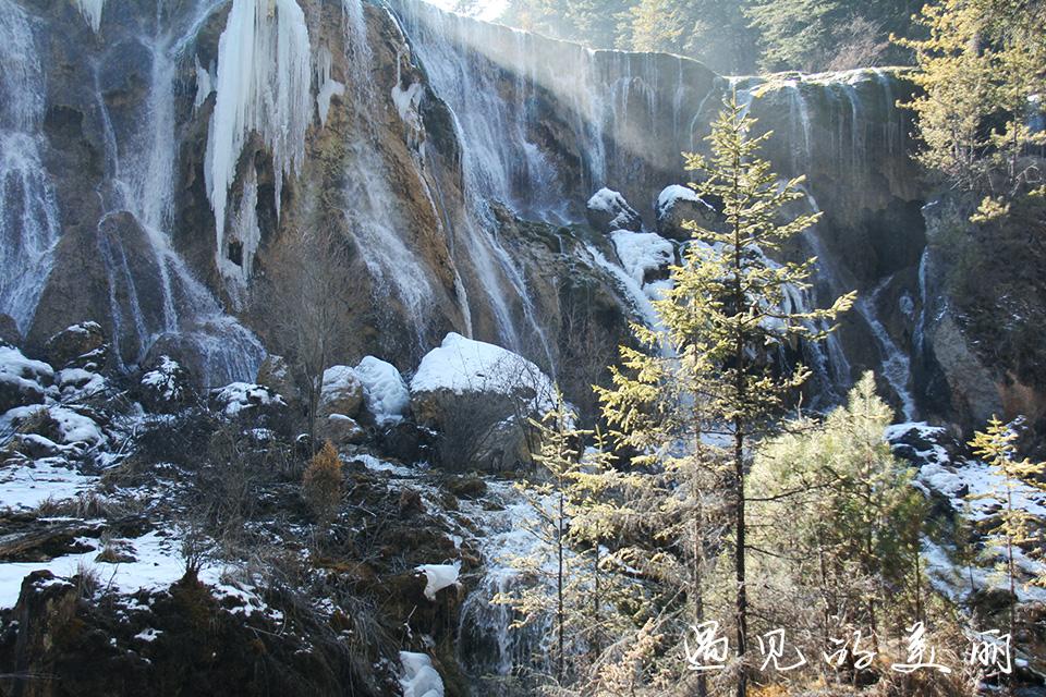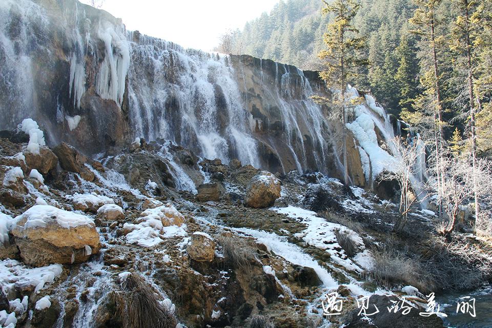 九寨沟珍珠滩瀑布珍珠滩珍珠滩整体比较平缓和宽广,湖水从高处流淌下来,在倾斜而凹凸不平的乳黄色钙化滩面上溅起无数水珠,在阳光照射下,点点水珠就像一颗颗跳动的珍珠,很有“大珠小珠落玉盘”的感觉。由于是冬季,很多灌木上挂着一串串冰珠,真的就像是把这些散落的珍珠串起来,挂在了胸前。冬季属于枯水季节,水量较少,珍珠滩瀑布的场景并不壮观。气温较低,流水在夜间会凝结成冰柱,湖水白天继续从高处流下来,与冰柱混在一起,形成冰瀑。