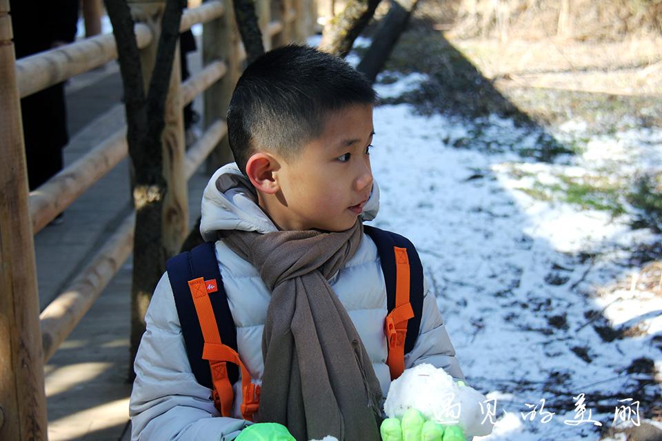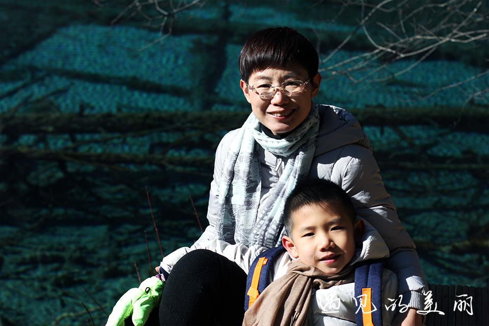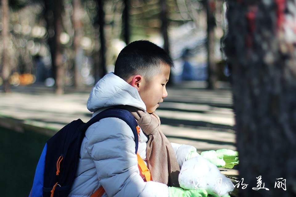 我们带着廉价的自热饭,尽量把更多的时间留在五花海。我们坐在五花海边的长凳上,一边吃饭,一边看景。孩子说:“老爸,你不觉得我们正在享受这个世界上最顶级的午餐吗?五花海就像是火锅锅底,里面的枯木就是牛羊肉,翠黄色的是鸡肉和玉米,绿色的是海带和鲜蔬,红色的是辣椒,紫色的是花椒,……”我表示认同。吃过午饭,孩子在湖边玩雪,妻子坐在五花海边上的台阶上晒太阳。一个人玩雪太寂寞,孩子也跑到湖边的台阶上去晒太阳,这时候,好希望时光能停下来。