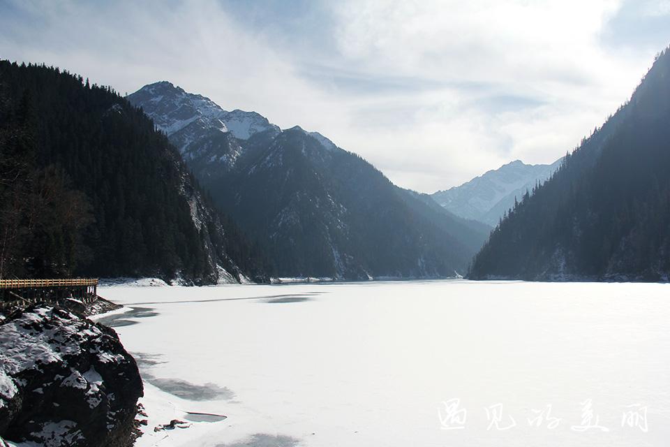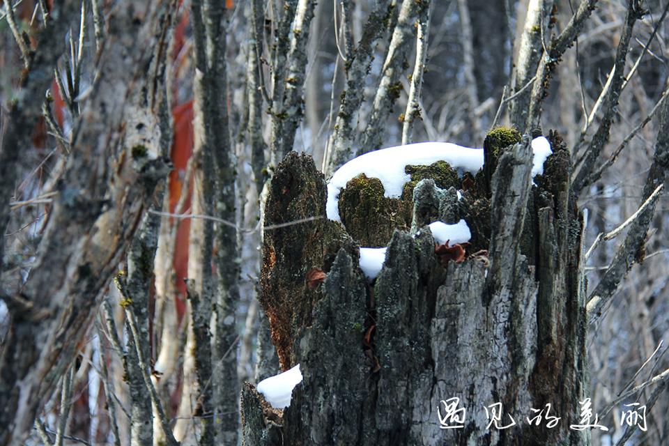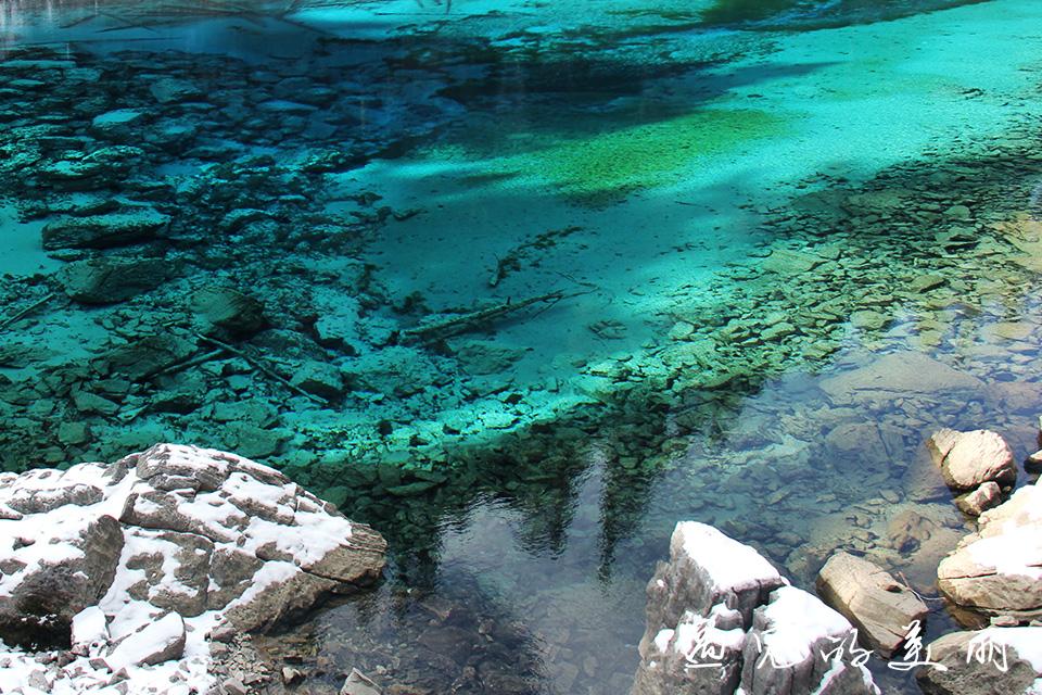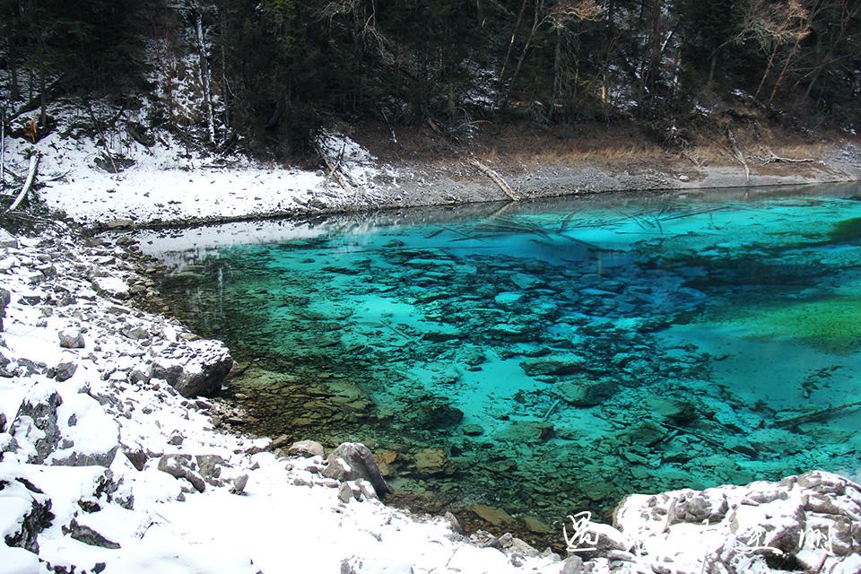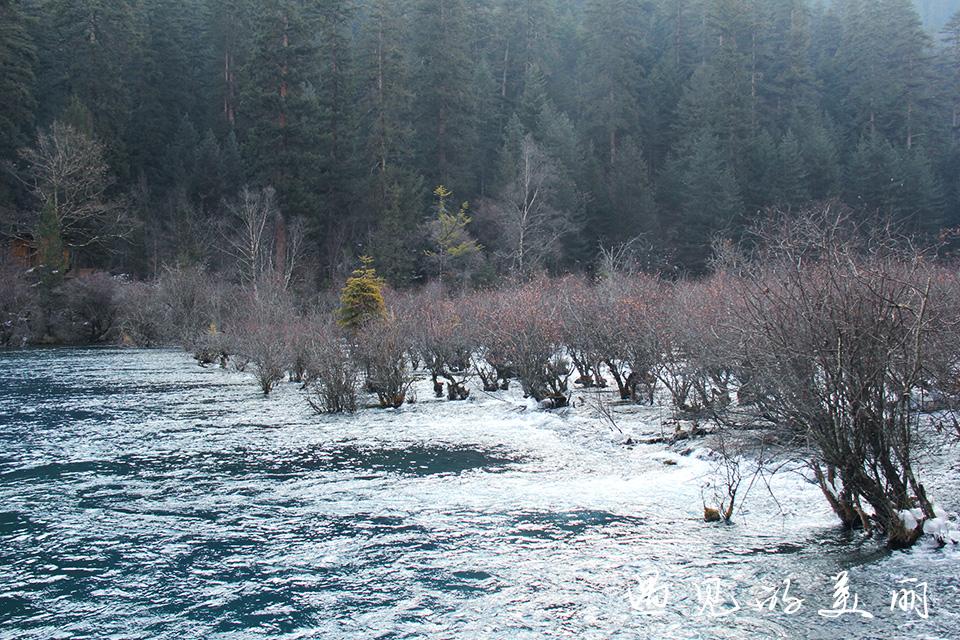 九寨沟五彩池旁树桩上的积雪犀牛海我的双脚已经被凝固在五彩池岸边了,一步也无法移动。可是景区巴士不会等我,坐上巴士前往犀牛海,途中会经过上季节海和下季节海。九寨沟的天气也是很多变,坐在车上的时候看到了雪花,竟然开始下雪了。很希望司机大哥能把车停下来,让我们到上季节海去感受一下这九寨沟的大雪纷飞。导游大姐说了,下车不是不可以,但是下车的游客需要自己走出景区,而且你可能没有时间去看其它景点了。带着遗憾,我们来到了犀牛海。犀牛海是九寨沟中景色变化最多的海子,也是九寨沟的第二大海,其倒影是九寨沟众多海子中最美的。每年秋天,犀牛海周围的彩林亮丽多姿,艳冠群芳。蓝天白云、彩林雪峰倒影在海子中,异常梦幻。我们光顾的时间不对,冬天的下午。天气也不作美,寒冷有风,但没有落雪。