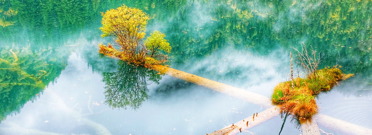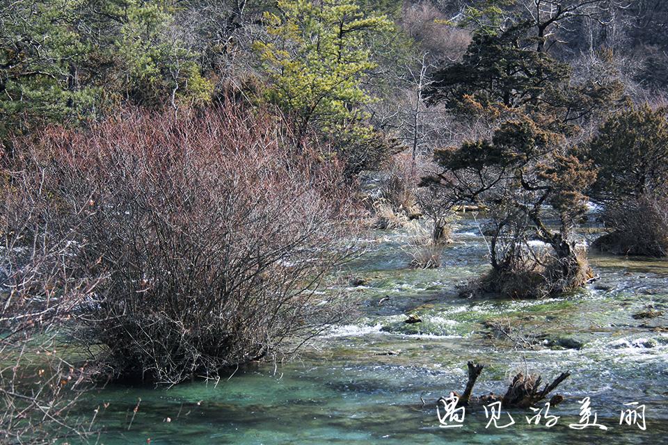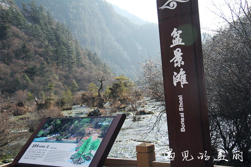 九寨沟犀牛海盆景滩景区巴士将我们从犀牛海带到了盆景滩。盆景、盆栽大家都见过,可是他们出自园丁或工匠之手。九寨沟的盆景是没有经过人工雕琢,纯粹出自大自然之手。湖水从高处平铺下来,薄薄的一层,流经这块或金黄或银白的钙化滩,发出悦耳的“叮咚”声。在盆景滩生长着许多喜欢水性的植物,如杜鹃、杨柳、柏树等。小鸟们会停留在树梢,他们是九寨沟的主唱,风、雪、湖水为它们伴奏。大自然的声音与九寨沟的湖水、雪山、树木等景观交织在一起,宛若一场立体的交响音乐会,视听盛宴。