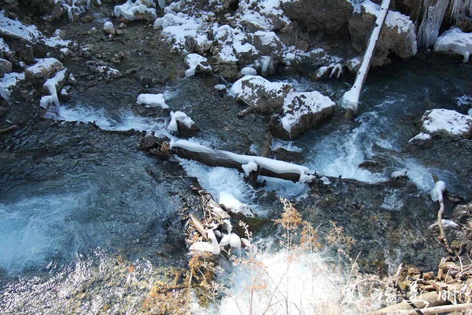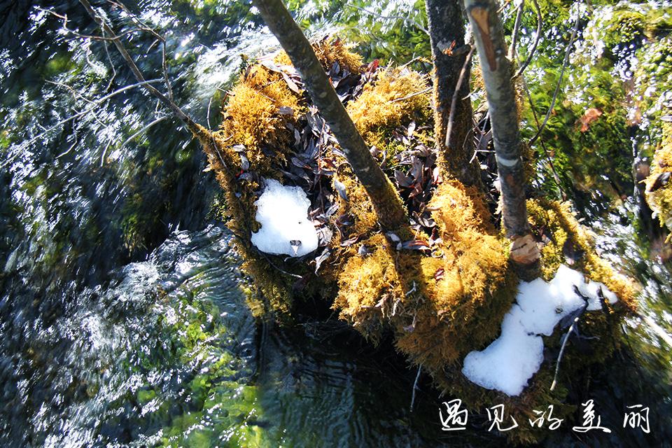 树正群海很难将脚步从这里挪开,但是停靠在双龙海的旅游巴士要带我前往树正瀑布了,去那里看树正群海。不同于纯白的冰雪世界,在这里可以观赏晶莹的蓝冰。漫步树正群海身临雪景,零星的小雪堆穿杂在群海之中,流水冲刷着洁白的冰晶,古树在海子中向上伸展,老屋在流水中挺立。这一切,犹如洁白高雅的水墨画。又好像是一部时光机,这些画面已深深刻入脑海中。