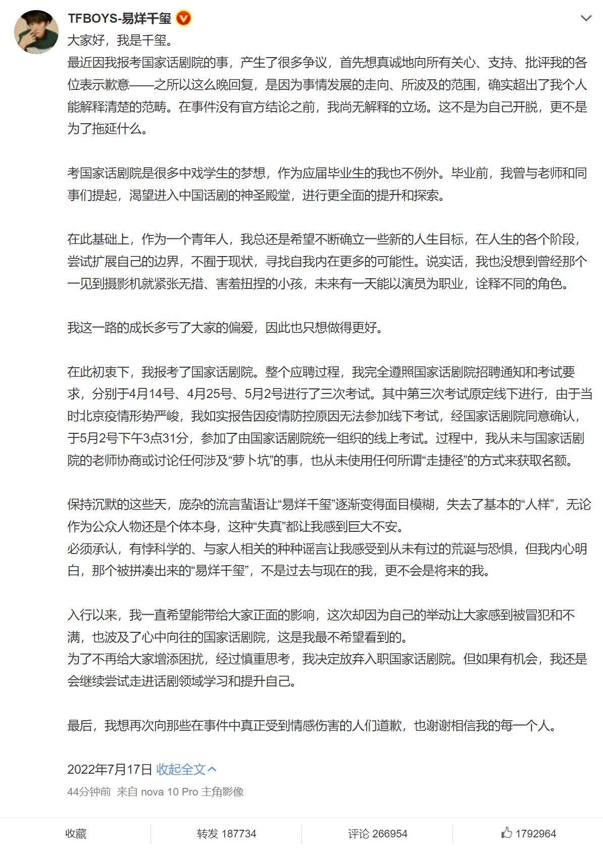 7月17日上午,易烊千玺发长文回应连日来的报考国家话剧院风波。