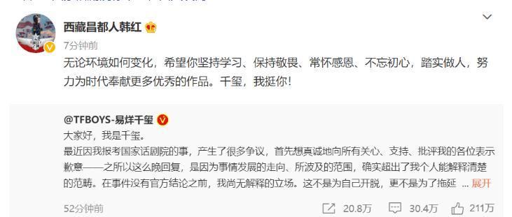 在易烊千玺发长文回应之后,韩红也是第一时间发文力挺易烊千玺,并且是用20个核心的字眼支持他,耿直的韩红是真心希望弟弟越来越好。