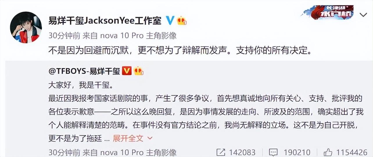 粉丝们落泪替易烊千玺不公,甚至喊话易烊千玺受到了太多的委屈。但事情发展到现在这一步,易烊千玺决定退出入职国家话剧院,另外就是解释了整个线上录取考试的过程。