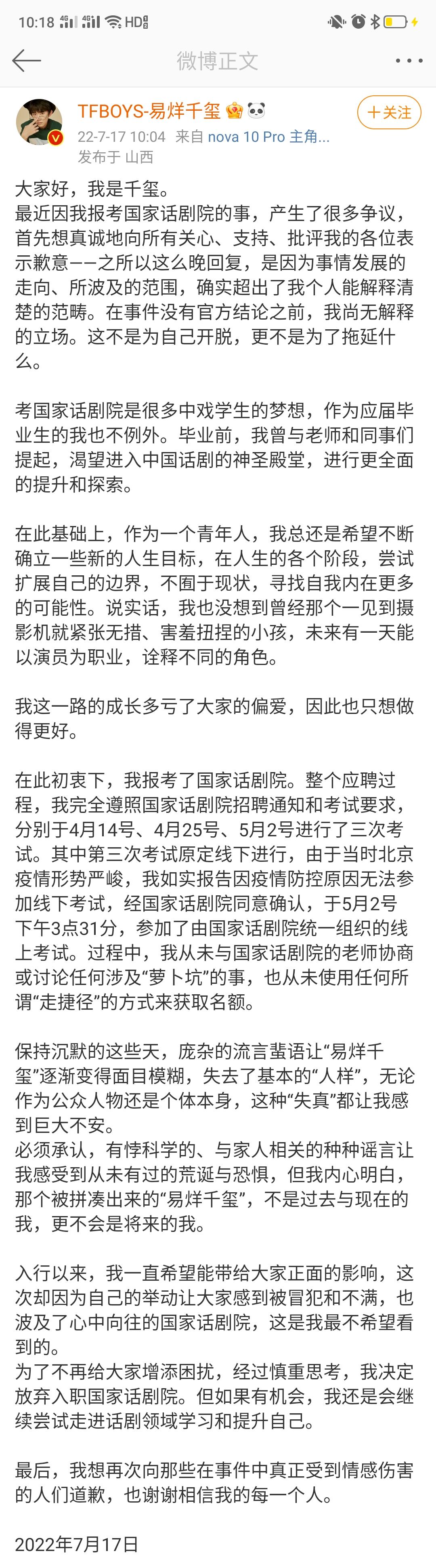 易烊千玺在7月17日终于回应了关于国家话剧院录取的事情,对于此事,易烊千玺的态度是向大家道歉,向所有受到伤害的人表示说一声对不起。