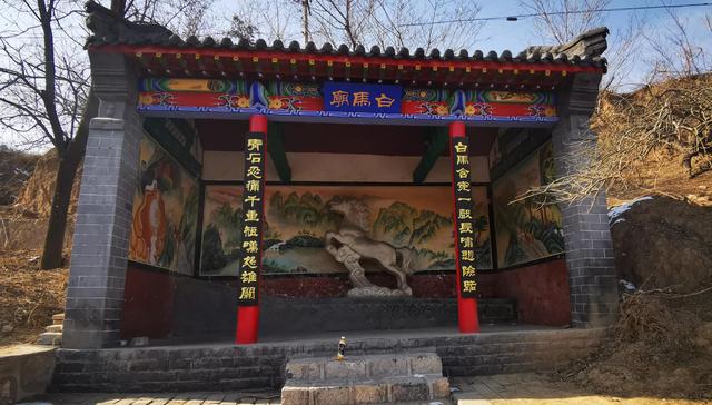 白马庙建在一段大斜坡下,庙中供奉着一匹扬蹄奋鬃的白马。庙前一幅楹联“白马含冤一声长啸悲险路,青石忍痛千重短叹怨雄关。”关于此庙,有一段“白马告状”的传说。