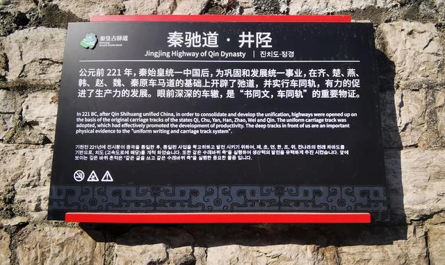秦皇古驿道深及尺余的历历车辙显示出当年这里车水马龙的繁华景象。古驿道上的车辙间距与西安出土的秦兵马俑战车的轨距相同,也成为“车同轨,书同文”的唯一历史物证。